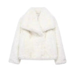 The Alena Fur Jacket in beige is made from soft, high-quality artificial fur. Its short cut with a wide collar and slightly tailored fit creates a flattering silhouette while offering a soft, comfortable touch.